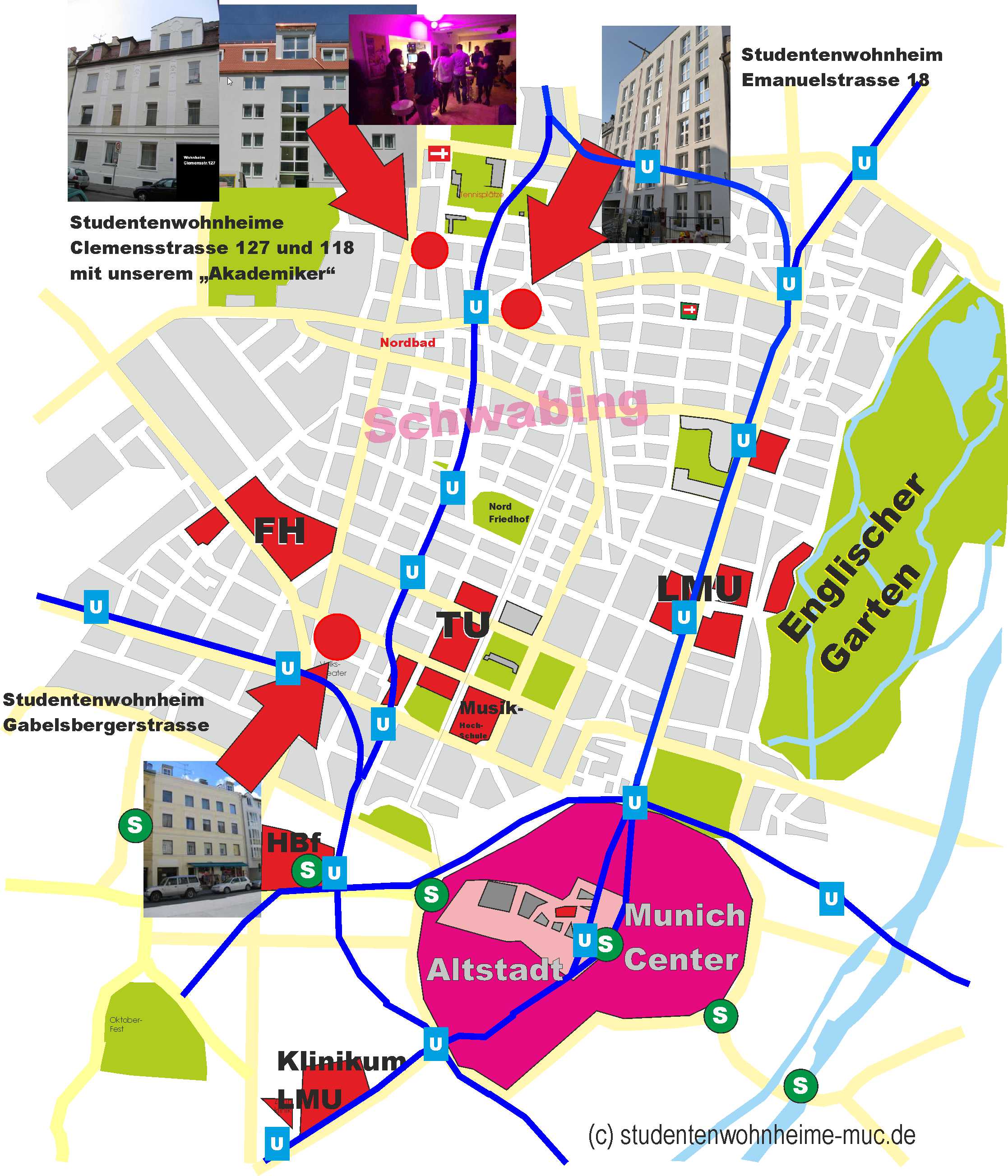 Our halls of residence are in the university quarter of Munich, in the middle of Schwabing. Schwabing has always been one of the preferred residential areas for young people. The central location, the distinct cultural life and the distinct nightlife are the reasons for this. The transport connections are excellent. All the shops of daily life can be reached in a few steps, and the English Garden is also not far away.